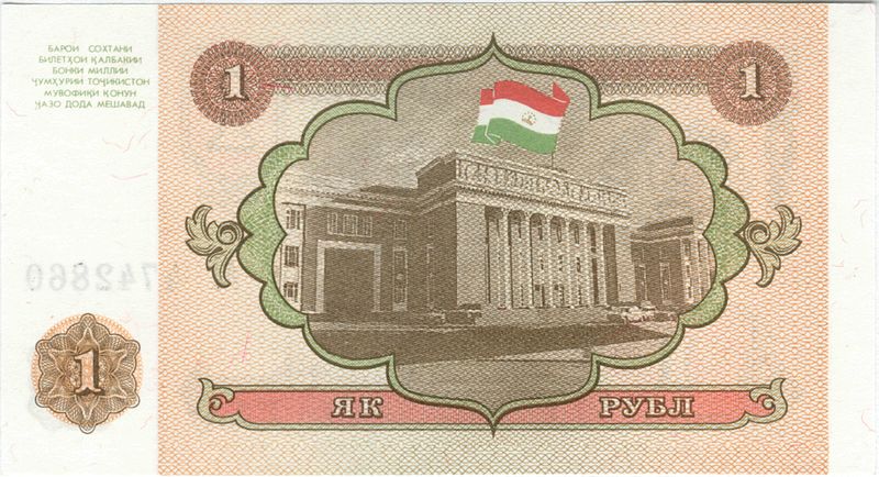 Оборотная сторона: Флаг Таджикистана над зданием парламента республики.
