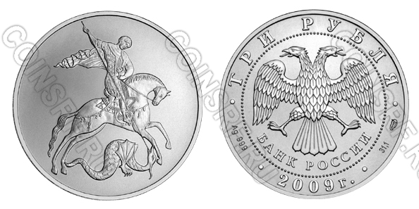 в центре — эмблема Банка России (двуглавый орёл с опущенными крыльями, под ним — надпись полукругом «БАНК РОССИИ»), обрамленная кругом из точек и надписями по кругу — вверху: «ТРИ РУБЛЯ», внизу: слева — обозначения драгоценного металла и пробы сплава, в центре — дата выпуска «2009 г.», справа — содержание химически чистого металла и товарный знак монетного двора.